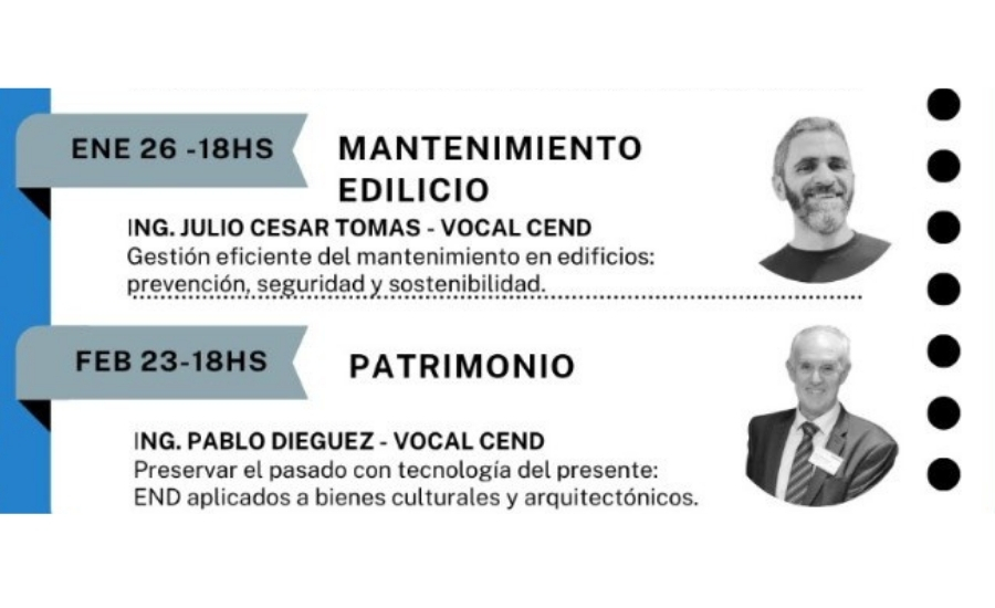 El CEND ha lanzado el Ciclo de Diálogos “Prestadores y Usuarios en Ensayos No Destructivos”, una serie de encuentros abiertos con cupos limitados que propone conectar la innovación técnica con la experiencia aplicada. La próxima charla será el 26 de enero de 2026 a las 18 horas, sobre «Mantenimiento Edilicio» dictada por el Ing. Julio César Tomas.