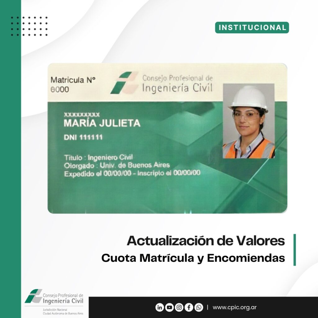 El Consejo Profesional de Ingeniería Civil (CPIC) ha resuelto actualizar la primera cuota trimestral del derecho de matrícula para el año 2026, con vencimiento el 12 de Enero de 2026.