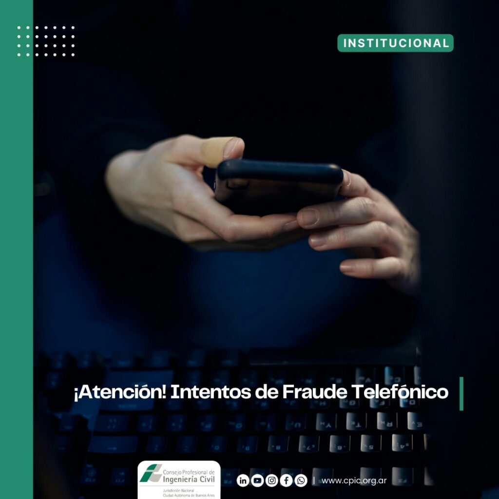 Se han detectado intentos de fraude telefónico dirigidos a profesionales de la ingeniería civil, solicitando datos personales o claves bajo pretextos falsos relacionados con el Consejo. Seguimos recibiendo reportes de matriculados que han sido contactados por terceros que, haciendo un uso indebido del nombre del CPIC, intentan obtener información personal o realizar cobros no autorizados. Esta noticia busca alertar y prevenir para proteger a nuestra matrícula.