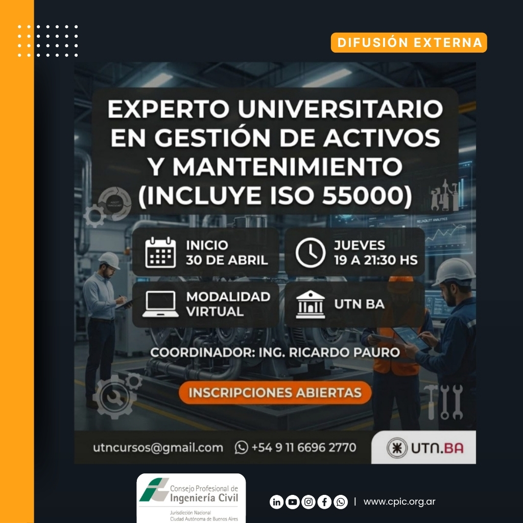 Nuestro Consejo Profesional de Ingeniería Civil (CPIC) informa que la Universidad Tecnológica Nacional (UTN BA) lanzó la 16ª edición del “Experto Universitario en Gestión de Activos y Mantenimiento – incluye ISO 55000”, una propuesta académica orientada a fortalecer la gestión eficiente de activos físicos en organizaciones de diversa índole. En un contexto donde la optimización de recursos y la sostenibilidad operativa resultan de gran interés, la formación se posiciona como una valiosa herramienta para profesionales y técnicos del sector. El programa está dirigido a especialistas vinculados a proyectos, operaciones, mantenimiento, arquitectura y facility management, abarcando industrias como energía, transporte, manufactura, petróleo y gas, construcción, agroindustria y servicios, entre otras. Asimismo, resulta adecuado tanto para quienes ya se desempeñan en estas áreas como para aquellos interesados en iniciarse en el campo de la gestión de activos. El cuerpo docente está liderado por el Ing. Ricardo Pauro y conformado por profesionales con amplia trayectoria, quienes abordarán contenidos como implementación de la norma ISO 55000, gestión del riesgo y del conocimiento, análisis de causa raíz (RCA), mantenimiento predictivo, indicadores de desempeño (KPIs), digitalización, redes industriales y facility management. Al finalizar, se otorgará el certificado de Experto Universitario emitido por la UTN BA. Para más información: sceu.frba.utn.edu.arInteresados enviar su CV para admisión a: utncursos@gmail.com