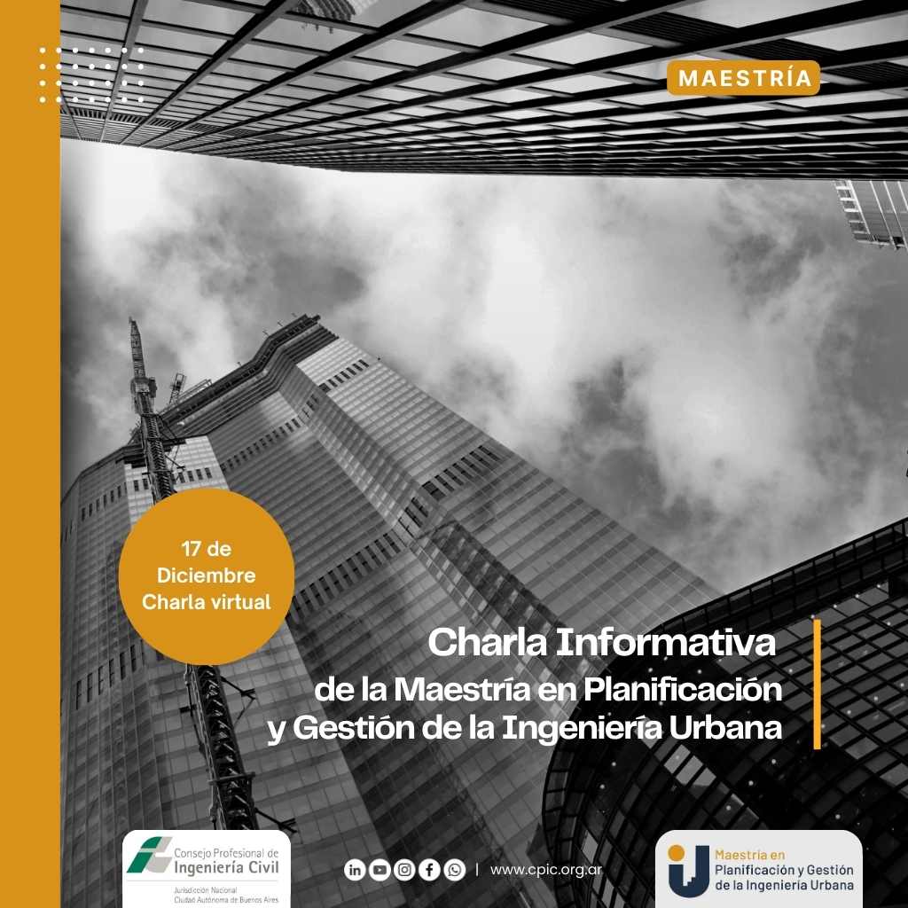 El Consejo Profesional de Ingeniería Civil invita a participar de la charla Informativa de la Maestría en Planificación y Gestión de la Ingeniería Urbana (MPyGIU) el 17 de diciembre de 2025 a las 19:00 horas, bajo modalidad virtual.