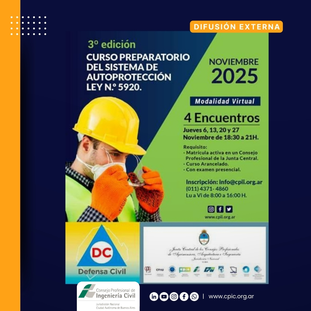 El curso se dictará de manera virtual los días 6, 13, 20 y 27 de noviembre de 2025, con un valor de $250.000 (idéntico al de las tres ediciones anuales). La capacitación se desarrolla en el marco del Convenio de Cooperación firmado entre la Dirección General de Defensa Civil y la Junta Central de los Consejos Profesionales, con el objetivo de brindar a las personas interesadas en la temática las herramientas necesarias para una aplicación adecuada y ágil del Sistema de Autoprotección y para el conocimiento de la normativa vigente.