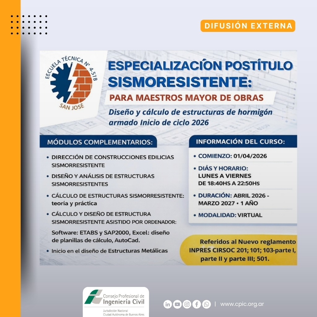 La especialización se encuentra referida al nuevo reglamento argentino INPRES-CIRSOC, considerando las disposiciones de los reglamentos 201, 101 y 103 —en sus partes I, II y III— y el CIRSOC 501. Las inscripciones se realizan de manera presencial en la sede ubicada en Uruguay 670, San José, Guaymallén, provincia de Mendoza, de lunes a viernes entre las 18:30 y las 22:00 horas.