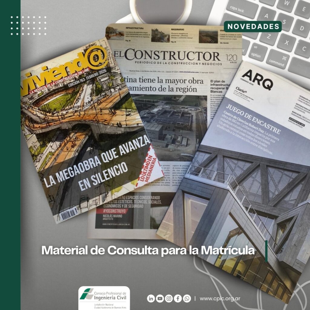 El Consejo Profesional de Ingeniería Civil informa a su matrícula que ya están disponibles para consulta presencial los ejemplares de febrero de las revistas Vivienda y ARQ (diario Clarín) y del periódico El Constructor.