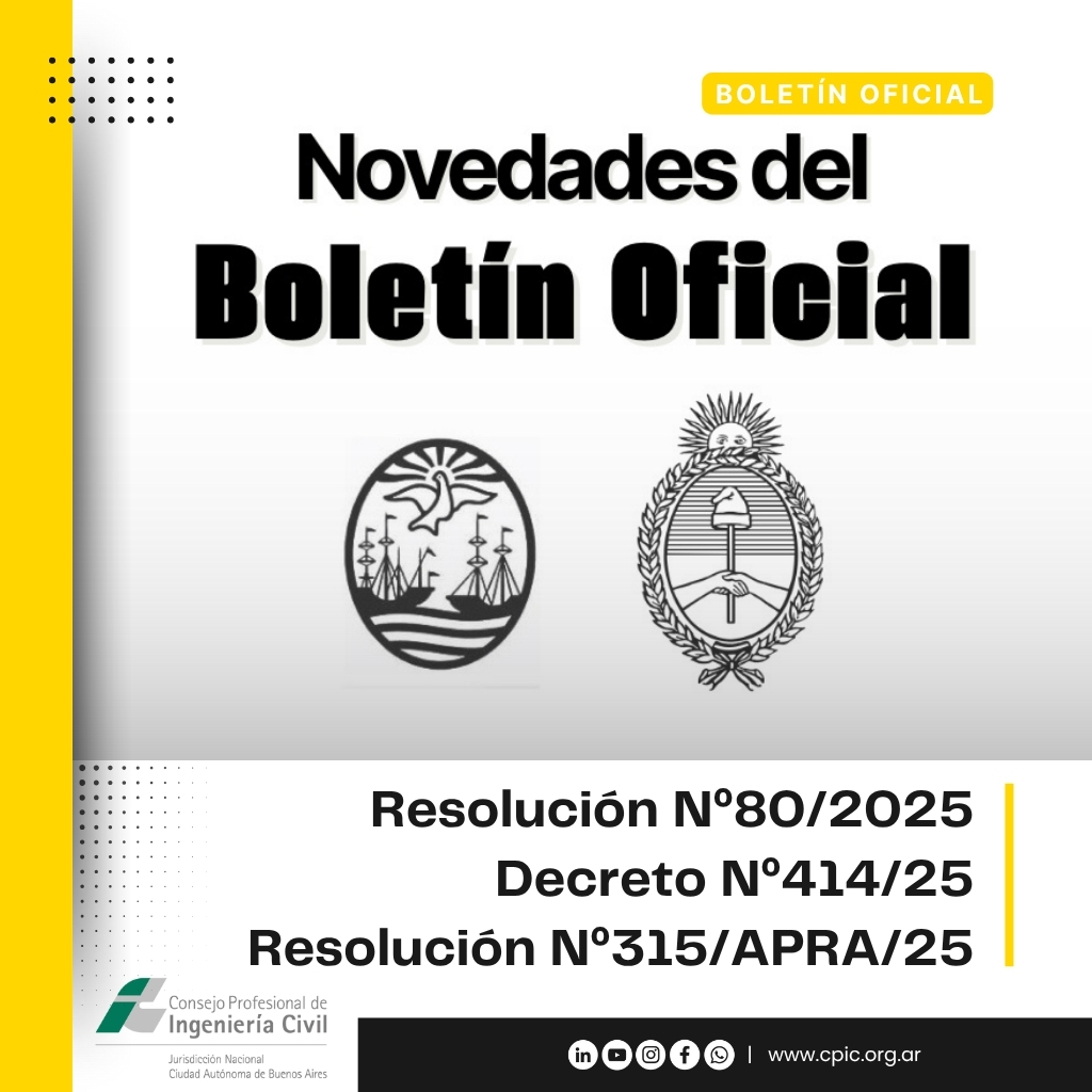 El Consejo Profesional de Ingeniería Civil (CPIC), de jurisdicción nacional y de la ciudad de Buenos Aires, comunica las últimas normativas de interés para su matrícula.