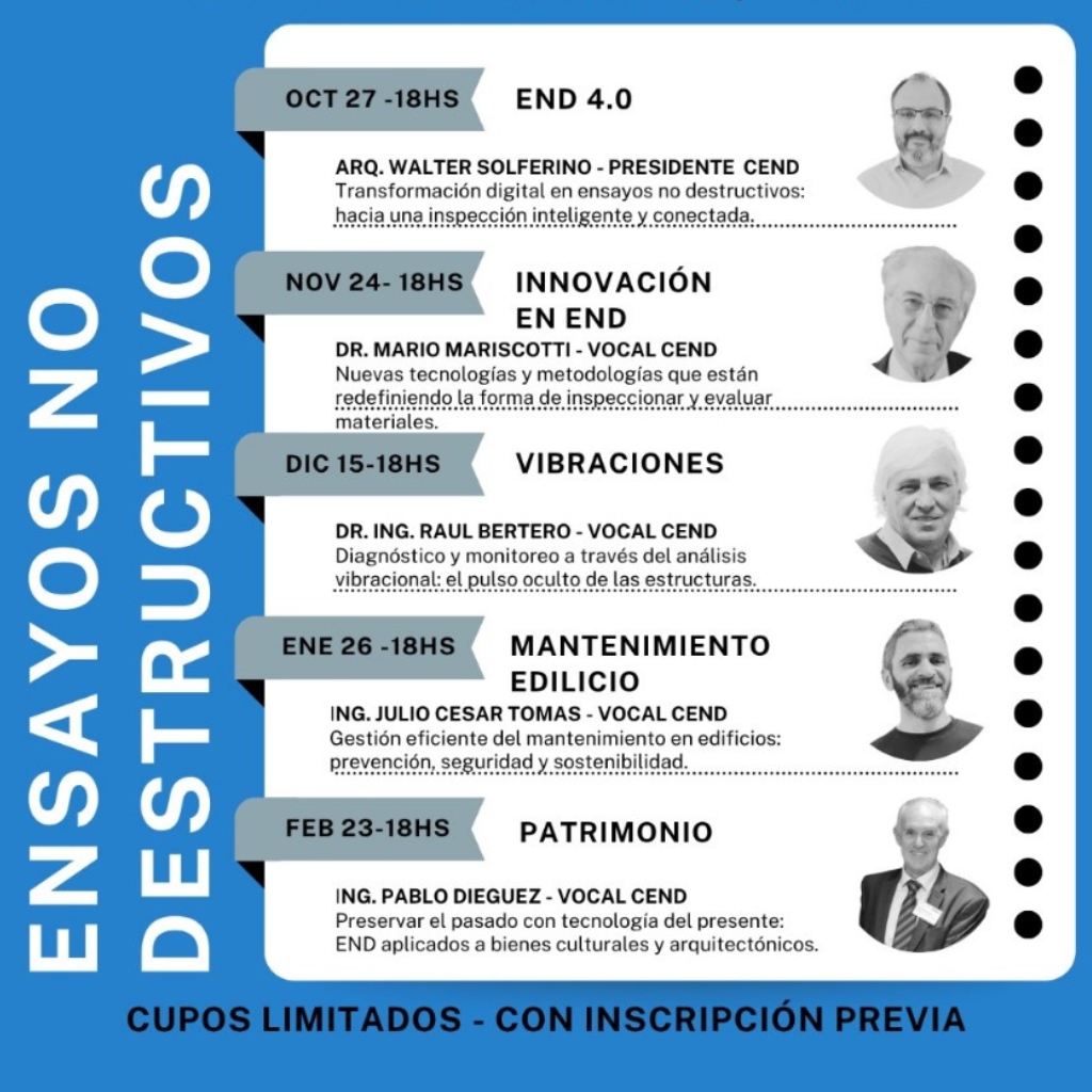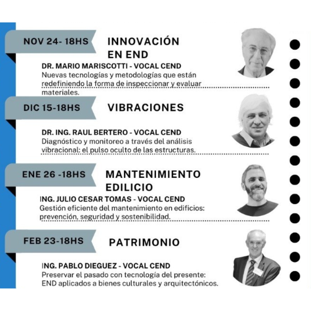 En el marco de sus actividades, el CEND ha lanzado el Ciclo de Diálogos “Prestadores y Usuarios en Ensayos No Destructivos”, una serie de encuentros abiertos con cupos limitados que propone conectar la innovación técnica con la experiencia aplicada. Bajo el lema “Diálogos entre prestadores y usuarios”, cada charla aborda los desafíos actuales y las oportunidades futuras de los END, tanto en obras de ingeniería como en intervenciones sobre el patrimonio arquitectónico.
