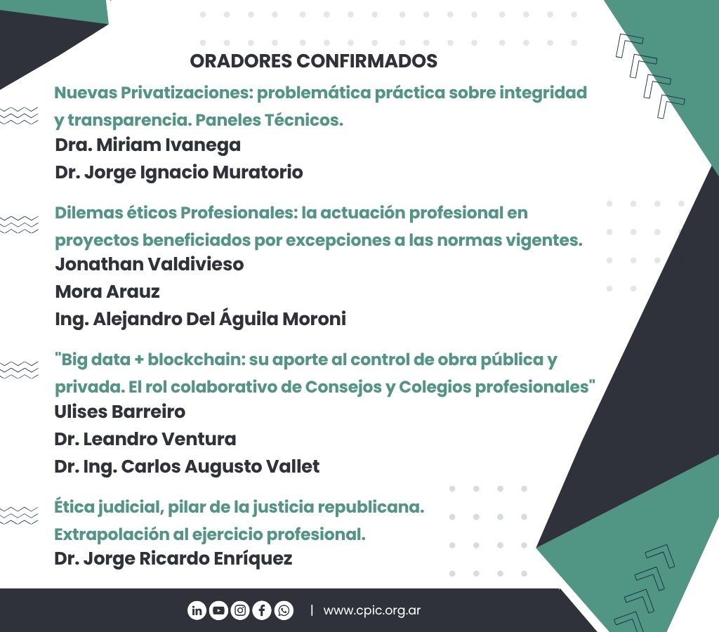 A través de paneles técnicos, especialistas abordarán temas como las nuevas privatizaciones y la problemática en la integridad y transparencia, los dilemas éticos en proyectos con excepciones normativas, el uso de big data y blockchain para el control de obras, y la ética judicial como fundamento del ejercicio profesional.