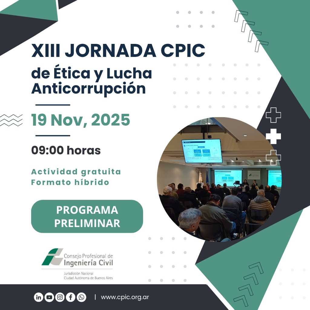 El programa de las Jornadas de Ética y Lucha Anticorrupción 2025 organizadas por el Consejo Profesional de Ingeniería Civil (CPIC) propone una agenda de reflexión y debate sobre los valores éticos que sustentan el ejercicio profesional y la gestión de obras públicas y privadas.