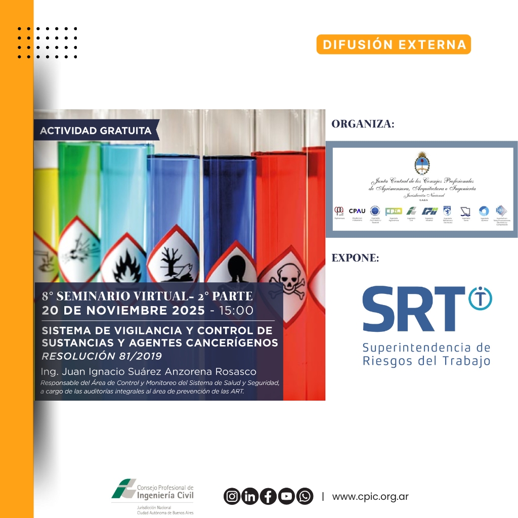 El Consejo Profesional de Ingeniería Civil invita al VIII Seminario Virtual SRT – 2ª Parte de la Junta Central de los Consejos Profesionales de Agrimensura, Arquitectura e Ingeniería, dedicado al Sistema de Vigilancia y Control de Sustancias y Agentes Cancerígenos (Resolución SRT 81/2019). La actividad será virtual, abierta y gratuita, el 20 de noviembre de 2025 a las 15:00 (hora Argentina).