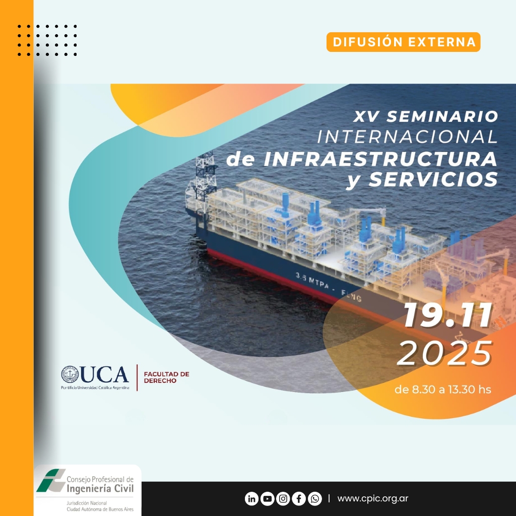 El XV Seminario Internacional de Infraestructura y Servicios, organizado por la Facultad de Derecho de la Universidad Católica Argentina junto con el Estudio Ymaz Abogados y el Estudio del Dr. Gabriel Jacobo, se llevará a cabo el miércoles 19 de noviembre de 2025 en el Edificio San José, sito en Av. Alicia Moreau de Justo 1600, primer piso, aulas 124 y 125. La jornada se extenderá de 8:30 a 13:30 horas y contará con la participación de destacados especialistas del ámbito jurídico, energético y de la infraestructura.